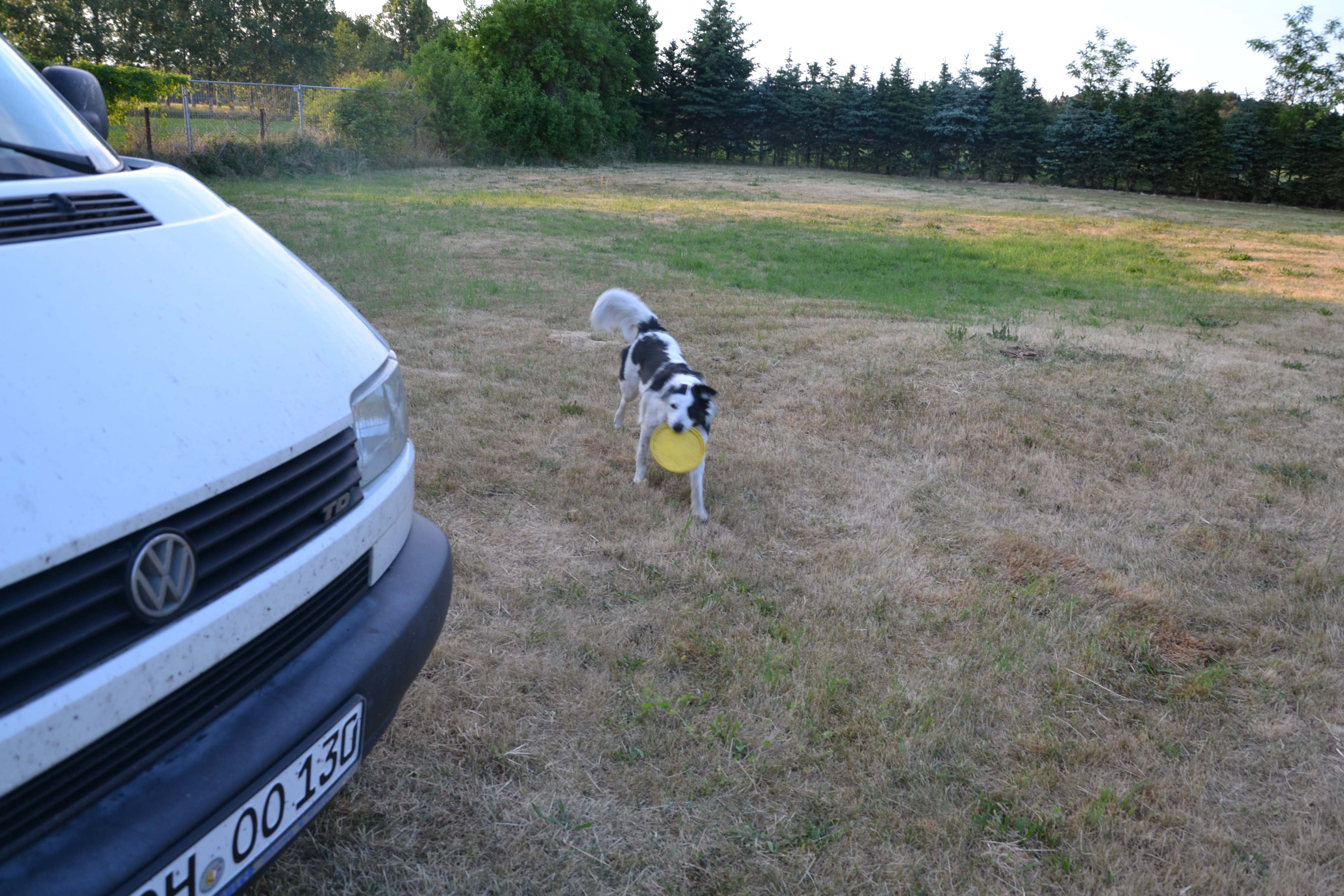 Gestern stand ich auf einem gräßlichen Stellplatz für 15€ ohne Wasser, Dusche und Klo. Manche Menschen denken auch, wenn sie ihre Wiese mähen, müssten WoMo-Fahrer dankbar sein! Nun denn, dafür flogen die Schwalben ums Auto, Fridel hatte eine riesige Tobefläche