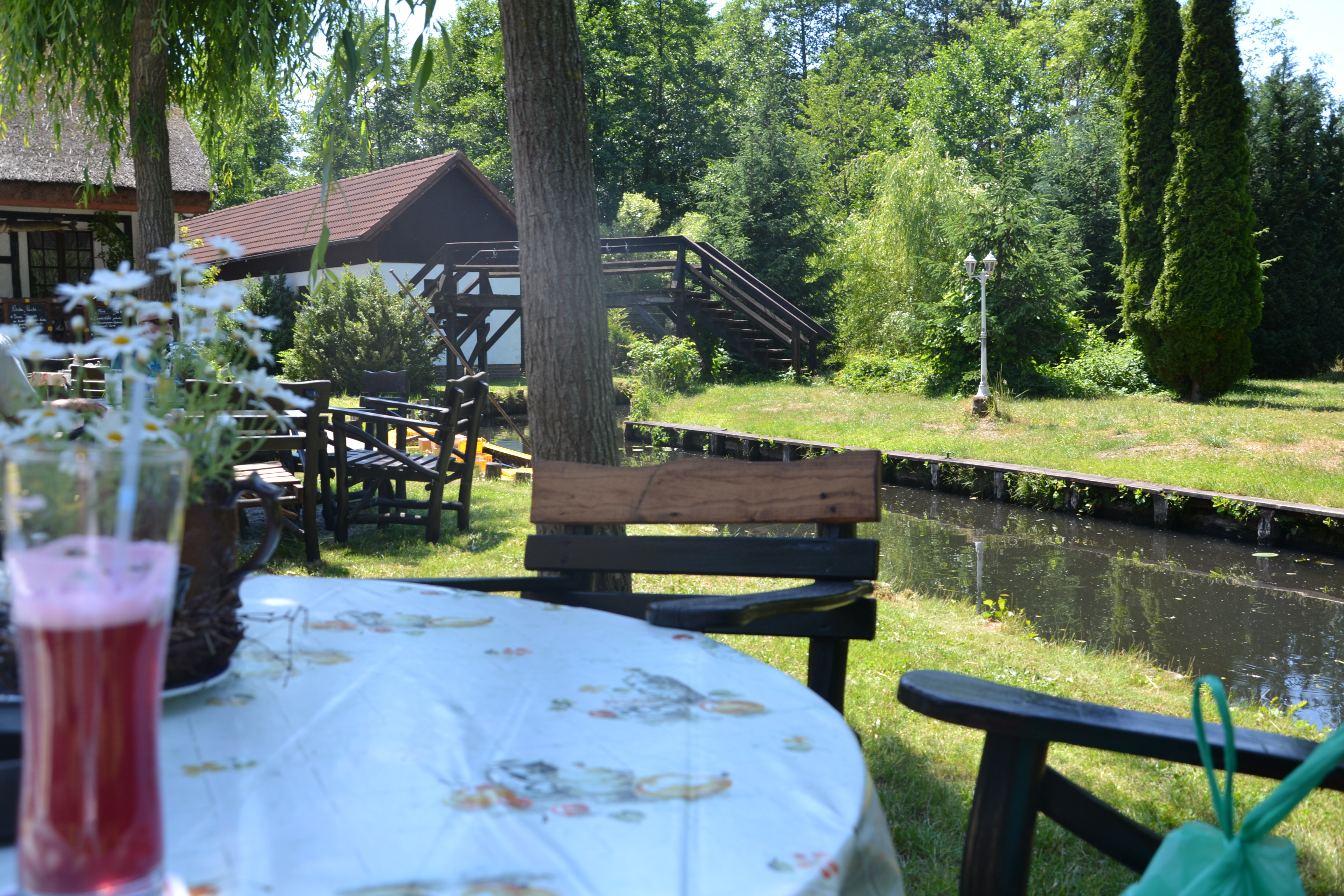gewandert. Dort gab`s Mittag: Heringe mit Pellkartoffeln und Gurkensalat. Dazu meine erste Berliner Weiße dieses Jahr. LECKER!!!!!!!!!! Und, echt natürlich hier, auch einen Napf mit Trinkwasser für Fridel.
