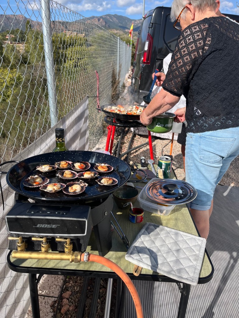 Tomatenstücke, rote Paprika, Erbsen, Oliven kurz in der Mitte anbraten, dann alles vom Rand unterrühren, die Shrimps und kleine Muscheln dazu, gehackter Knofel und Brühe, reduzieren lassen mit Deckel